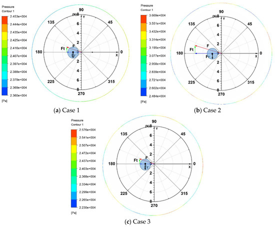 Figure 14 illustrates the transient static pressure distributions and the phasor diagram of the reaction force at the meridional cross-section of the annular seal in three different cases for x excitation and t = 0.2 s. In addition, the time-monitor signals of the rotor orbit position and the whirling direction are indicated as a blue circular patterning with a black straight arrow. As shown in Figure 14, the position of relatively higher pressure corresponds to the direction of resp onse force F in Case 1, while the number of peak pressures corresponds to the impeller blade number on the effect of inflow distortion in Cases 2 and 3. For each case, the force component Fr is 180 degrees out of phase with the rotor motion position, while the force component Ft is consistent with the rotor whirling velocity. This illustrates the nuclear coolant pump annular seal possesses negative effective stiffness and positive effective damping. The magnitudes of Fr and Ft in Figure 14a,c show almost identical values. While compared to the results in Figure 14a, the magnitudes of Fr and Ft in Figure 14b obviously increase. This can be used to explain that the effective stiffness and effective damping in Cases 1 and 3 have almost identical values, while the absolute value of effective coefficients for Case 2 are larger than that for Case 3. These conclusions are consistent with the observations in Figure 10.