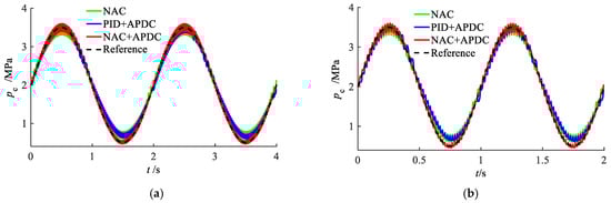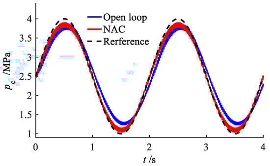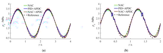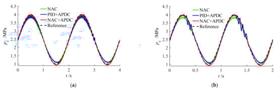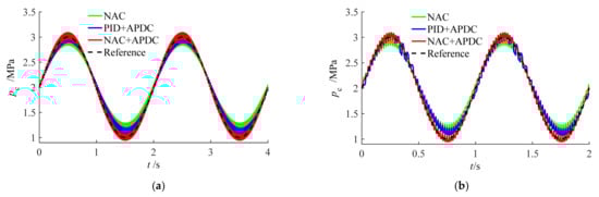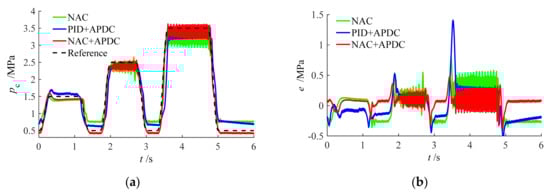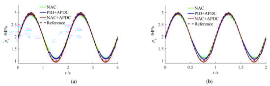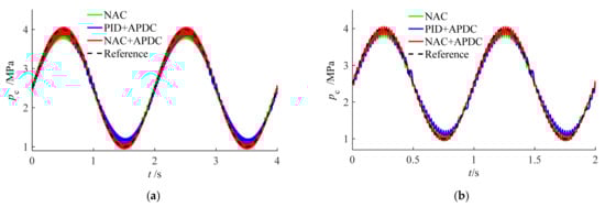 - Extensive comparative experiments demonstrate that, compared to the NAC and PID + APDC controllers, the proposed NAC + APDC controller ensured good tracking performance under different working pressures and tracking frequencies. For example, when tracking pressure signal was 1.5 sin (2π × 0.5) + 2.5, the three tracking indices (maximum error, average error, and error standard deviation) of the proposed NAC + APDC controller were reduced by 68.8%, 65.7% and 65%, respectively, compared to the NAC, while the tracking indexes reduction of the PID + APDC controller were all within 20%.