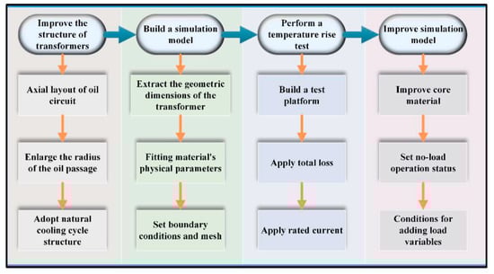 Given this issue, to reduce the no-load loss of the distribution network and improve the ability of overload operation, this paper constructs the HST simulation model of the AVDT under different load conditions and proposes a differentiated evaluation method considering the part and its performances. Based on this model, the characteristics of HST and load capacity of the AVDT have been fully analyzed. In this paper, (1) a two-dimensional and three-dimensional model of a new vegetable oil distribution transformer is constructed using the FEM, the HST of them has been calculated and compared by COMSOL; (2) an online monitoring heat transfer test platform for the transformer is built to verify the simulation results; (3) for state evaluation, the HST and temperature rising limit of the AVDT are compared and analyzed under different load coefficients.