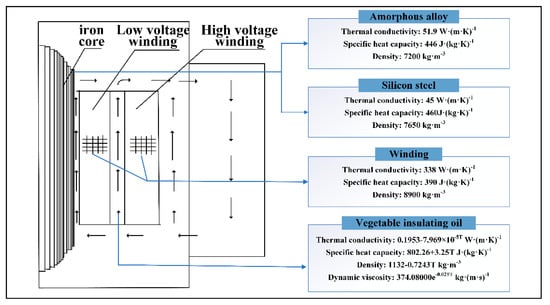 In the calculation of the multi-physical coupling field of the transformer, silicon steel and amorphous alloy were used for the core comparison. In addition, vegetable oil was used for the transformer oil, and copper was used for the winding material. The physical parameters are shown in Figure 3. When the temperature, pressure, and other parameters in the tank change, the physical parameters such as the density, thermal conductivity, and viscosity coefficient of the transformer oil will change accordingly. The law of change can be fitted to the above mathematical function.