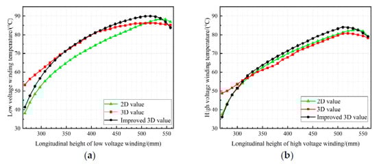 Synthesizing Table 3 and Table 4, for the calculation of the HST of the transformer, the error rate of the improved three-dimensional model was 0.31%, the three-dimensional simplified model was 5.86%, and the two-dimensional model was 2.78%. The accuracy of the improved three-dimensional model was significantly improved, and the calculation results are more in line with the actual HST of the transformer. Comprehensive analysis of the velocity field and temperature field, the improved three-dimensional calculation method proposed in this paper deviates from the two-dimensional and three-dimensional calculation results in some aspects: (1) the two-dimensional model does not consider the gradient change of the transformer temperature field along the circumferential direction. (2) The three-dimensional grid is a second-order element, which is inconsistent with the grid elements used in the two-dimensional model. (3) In the actual transformer, when the actual parameters are converted into the initial conditions of the plane simulation, where the error is relatively large. (4) The three-dimensional, simplified model does not consider the influence of oil flow in the axial direction on the heat dissipation of the winding. Therefore, compared with the actual transformer, the calculation results of the improved three-dimensional model are more in line with the internal distribution.