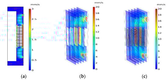 Fluid field distribution of the transformer. (a) Distribution diagram of two-dimensional flow field; (b) distribution diagram of three-dimensional flow field; (c) distribution diagram of the improved three-dimensional flow field.