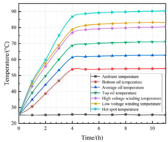 The test data of temperature rise is shown in Figure 9. It can be seen that the top oil temperature was 71 °C, and the bottom oil temperature was 54.4 °C when the thermal equilibrium was reached. The comparison of simulation result data and test results are shown in Table 3, and the relative error is shown in Table 4.