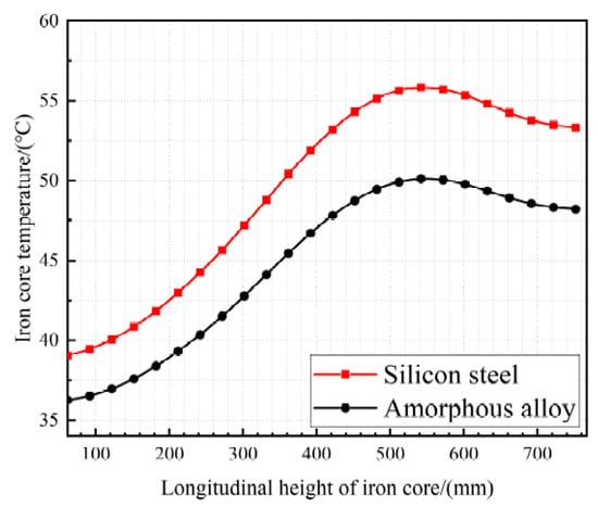 The amorphous alloy has the characteristics of high magnetic saturation, high permeability, low coercivity, and low saturation magnetic density, which results in a smaller no-load loss of the corresponding transformer, and a smaller heat source is applied to the transformer during no-load operation. Therefore, the average temperature rise of the core was lower than that of the traditional silicon steel transformer. The temperature rise of the core components when the transformer is running at no load is shown in Figure 10. It can be seen that the average temperature rise of the core using amorphous alloy material dropped by 4.66 K. Therefore, the use of amorphous alloys in the transformer core has engineering significance in the application of energy-saving for rural distribution networks.