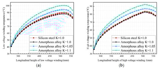 Temperature distribution of silicon steel transformer and amorphous alloy motor transformer. (a) Longitudinal temperature rise curve of low voltage winding; (b) longitudinal temperature rise curve of high voltage winding.