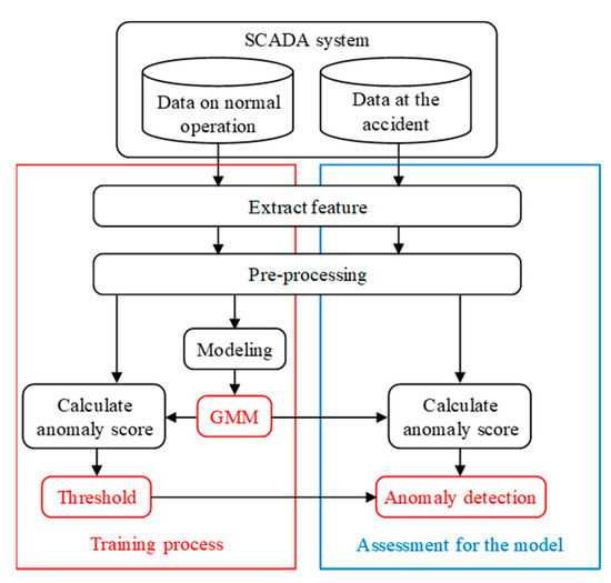 In the training process of the model, GMM is trained using the data on normal operation of the wind turbine. It is possible to calculate the degree of deviation from normal value as anomaly score by modeling the data on normal operation. Additionally, the threshold of the anomaly score is determined using anomaly score on normal operation calculated by the trained GMM.