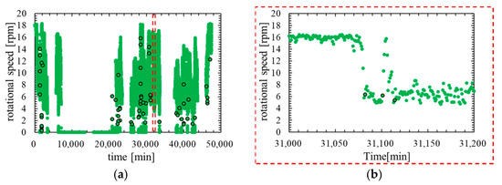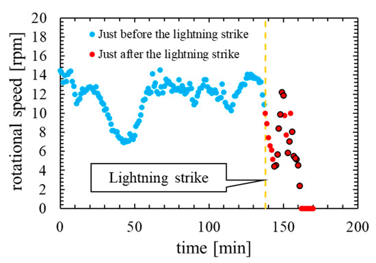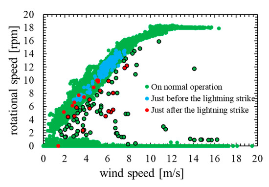 It is necessary to clarify the difference between the outliers that occur immediately after a lightning strike and the outliers that occur during normal operation by confirming the time characteristics of the rotational speed. Figure 3 shows time characteristics of rotational speed on normal operation. Figure 4 shows time characteristics of rotational speed before and after the lightning strike.