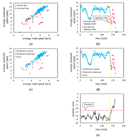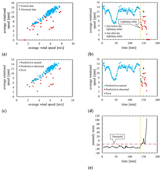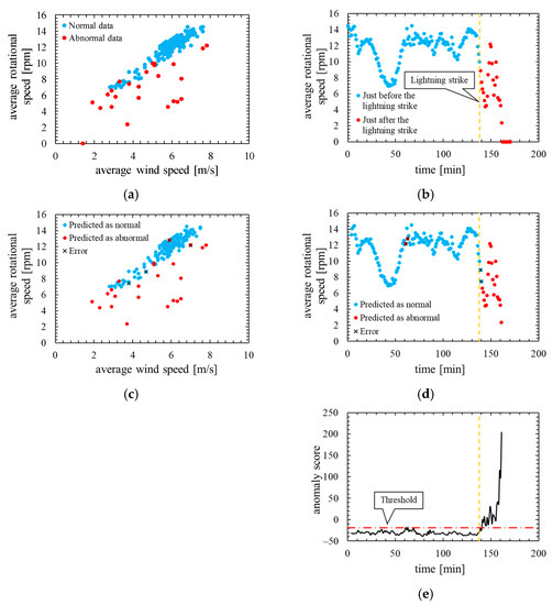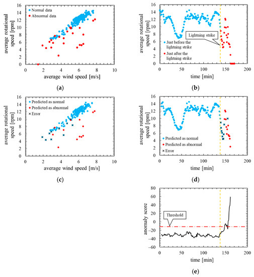Figure 5 shows the assessment result of this model. In Figure 5a,b, the blue dots represent the data immediately before the lightning strike, and the red dots represent the data immediately after the lightning strike. In the Figure 5c,d, the blue dots represent the data that the model predicted to be normal, and the red dots represent the data that the model predicted to be abnormal. Additionally, X is plotted against the data that were poorly predicted. Figure 5e shows the time characteristics of the anomaly score and its threshold.