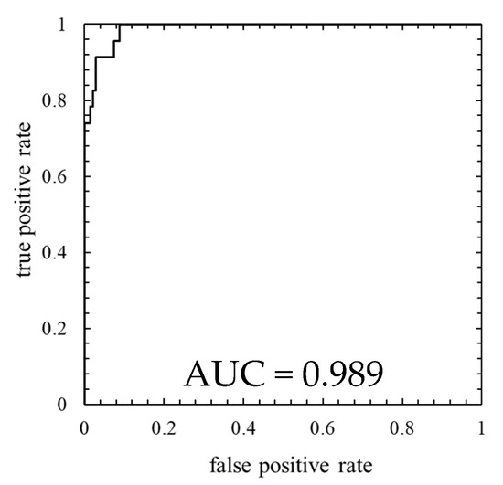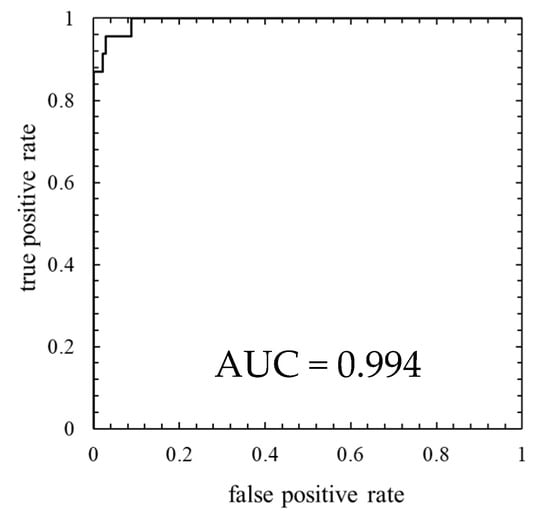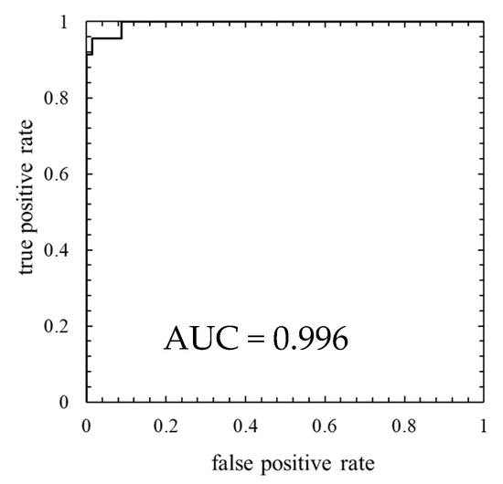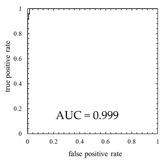 This result is assessed by the confusion matrix and the ROC curve. Table 7 shows the confusion matrix, and Figure 15 shows the ROC curve.