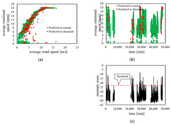 Training data of the model in which the number of mixture components K was 128 (threshold is 100th percentile’s value): (a) wind speed rotational speed characteristic; (b) time characteristics of rotational speed; (c) time characteristics of anomaly score.