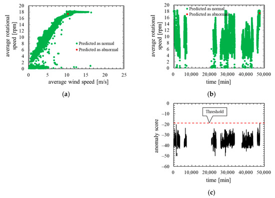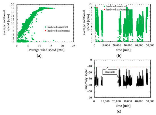 Training data of the model in which the number of mixture components K was 64 (the threshold is 100th percentile’s value): (a) wind speed rotational speed characteristic; (b) time characteristics of rotational speed; (c) time characteristics of anomaly score.