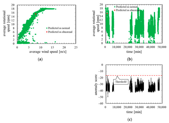 Next, Figure 7 shows the training data of this model. In Figure 7a,b, the red dots represent the data that exceed the threshold. Figure 7c shows the time characteristics of the anomaly score and its threshold.
