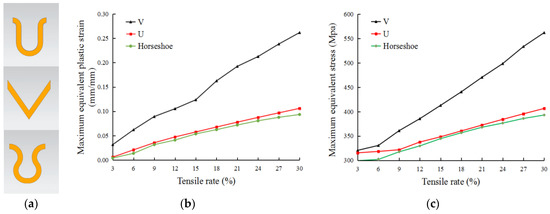 Finite element simulation of 3 types of interconnected electrode. (a) The 3 types of interconnecting electrodes; (b) relationship between maximum equivalent stress and tensile rate; (c) relationship between maximum equivalent plastic strain and tensile rate.