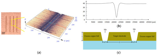 When separating the target electrode from the excess copper foil, contact or pull between the target electrode and the excess copper foil should be avoided to prevent the target electrode from shifting or being detached from the substrate. As shown in Figure 6a, the cut morphology of copper foil was observed by super depth-of-field microscope DSX510 (Olympus, Japan), and Figure 6b was the cut section. As the upper surface of copper foil receives more energy during laser cutting, the width of the upper surface of the cut is larger than that of the lower surface, and the cut section is approximately trapezoidal. At the same time, a small amount of molten metal material accumulated on both sides of the incision surface, affecting the stripping.