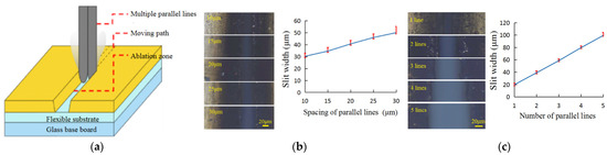 The copper foil with thickness of 40 μm was used for laser multi-parallel cutting with laser cutting speed of 150 mm/s, pulse repetition frequency of 80 KHz and processing times of 10 times. Figure 7b shows the relationship between the slit width and the spacing of two parallel lines during laser processing. When the line spacing gradually increases from 10 to 30 μm, the slit width gradually increases from 30.2 to 50 μm.