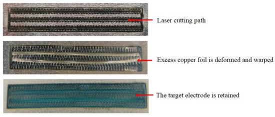 Laser can be used to directly scan the local small area of the interface material, resulting in the phenomenon of microstructure change and local deformation of the sample, so as to realize the stripping of the upper film and the substrate, and facilitate the transfer of printing on the recipient substrate or the transfer of micro devices [22,23]. Of large-area excess copper foil is easy to peel, but the local small area of copper foil is harder to distinguish to the naked eye or excess detachment (especially in electrode populated area), for these areas can use the high speed laser scanning way, make its produce deformed, at the same time corresponding to the bottom of the colloid viscosity decreased, pulled away from the basal part area, so that it can be identified by the naked eye and removed smoothly. Figure 8 shows the laser assisted stripping process. In the experiment, the copper foil in the target area was scanned at a high speed (10,000 mm/s, 100 KHz) by laser according to the predetermined pattern. After scanning the excess metal area, part of the area was deformed by heat and warped from the base. After laser treatment, the copper foil was easily stripped manually.