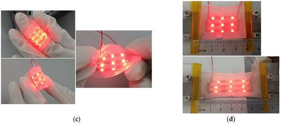 A 3 × 3 LED array circuit was fabricated by the above process. As shown in Figure 11, the array circuit is mixed with 9 LEDs. The array circuit is 32 mm long and 18 mm wide. The copper foil with thickness of 40 μm was selected, and the double parallel line laser cutting with line spacing of 10 μm was adopted. The excess copper foil outside the wire was stripped by laser assisted to prepare the electrical layer, and the LED was welded on the pad and packaged. The results of deformation test show that the circuit can work normally under bending, folding and torsion. After 50% tension, the circuit still maintains good electrical and mechanical properties.