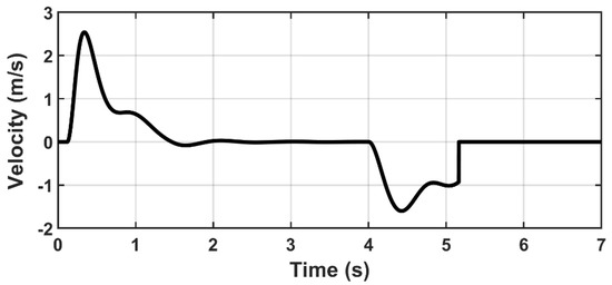 The results of numerical modeling are also depicted in Figure 6 (blue line). As we can see, the application of a hydraulic damper shows effectiveness in decreasing the velocity of the loading arm of the PAM-based manipulator. The velocity is decreased from 5.7 m/s to 1.5 m/s.