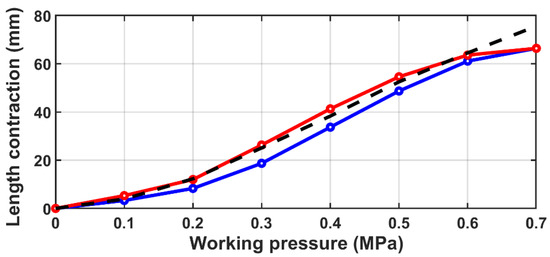 Figure 13, Figure 14 and Figure 15 illustrate the hysteresis loop of the length contraction–pressure relationship. The blue line corresponds to the process of lifting a load (inflation of the bladder) and the red line corresponds to lowering a load (deflation of the bladder). The experimental results show that the hysteresis loop maximum height is about 12.7 mm and width is about 0.07 MPa for load mass 2.5 kg, maximum height is about 12.1 mm and width is about 0.07 MPa for load mass 5.0 kg, and maximum height is about 7.6 mm and width is about 0.04 MPa for load mass 7.5 kg.