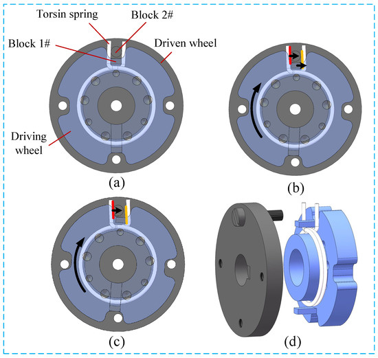 Usually, rigid joints are used to ensure precise motion trajectories, while in the mechanism, the torsion springs are connected in series in flexible joints to achieve compliance. The rigid-flexible characteristics of the LLRR are obtained by the combined design of rigid components and torsion springs. As shown in Figure 2, the flexible joint consists of a torsion spring and two rigid wheels (made of aluminum alloy material) in series, which have the same axis of rotation. The driven wheel has a first limit block which is connected with the output shaft, while the driving wheel has a first limit block and a chute, which is connected to the motor. The torsion spring is arranged between the driving wheel and the driven wheel, and the torsion arms of the torsion spring are staggered, and the first limit block and the second limit block are clamped in the two torsion arms. Because of the existence of the spring, the second limit block in the initial position is located in the middle of the chute and does not contact the driving wheel. When the motor drives the driving wheel to rotate, the driving wheel and the driven wheel rotate relative to each other, and the second limit block is not in contact with the chute. At this time, the first limit block on the driving wheel drives one torsion arm of the torsion spring to rotate, the other torsion arm drives the second limit block to rotate, and the driving wheel and the driven wheel transmit torque through the torsion spring. When the second limit block is in contact with the chute, the driving wheel, and the driven wheel are approximately fixed together and can be regarded as a rigid whole. At this time, the driving wheel directly transmits the torque to the driven wheel to drive it to rotate. Since the second limit block can only rotate in the chute of the driving wheel, the range of the torque provided by the torsion spring for the second limit block is within a fixed angle.