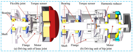 The developed LLRR has four active driving units, including two hip joint driving units and two knee joint driving units. The hip joint units are as shown in Figure 3a, which are driven by two servo motors (TBMS-6013-A00, Kollmorgen, Waltham, MA, USA), with each servo motor providing a torque of 0.413 Nm. The servo motors are also deployed with harmonic reducers (LHD-17–100-C-I, Leader Harmonious Drive Systems Co., Ltd., Suzhou, China, with a reduction ratio of 1:100), thus can output a maximum torque of 41.3 Nm, which can provide a strong power for the LLRR to drive the lower limbs of the human body. On each side, the reducer is fixedly connected to a torque sensor (M2210E, SRI, Nanning, China, with a capacity of 60 Nm) through the flange, and the other side of the torque sensor is fixedly connected to the main shaft , so the main shaft and the servo motor at the hip joint are rigidly connected. The knee joint units are as shown in Figure 3b, which are driven by two joint motors with internal drive (HT-03, HAITAI Electromechanical Co., Ltd., China, with continuous torque 6.9 Nm). The motor output shaft is directly connected to the torque sensor (M2210E, SRI, Nanning, China), the other side of the torque sensor is fixedly connected to the driving wheel of the flexible joint, and the driven wheel of the flexible joint is fixedly connected to the main shaft; Therefore, there is a flexible connection between the motor at the knee joint and the main shaft. All the four motors are deployed with incremental encoders to obtain the corresponding angular velocity and angular acceleration.