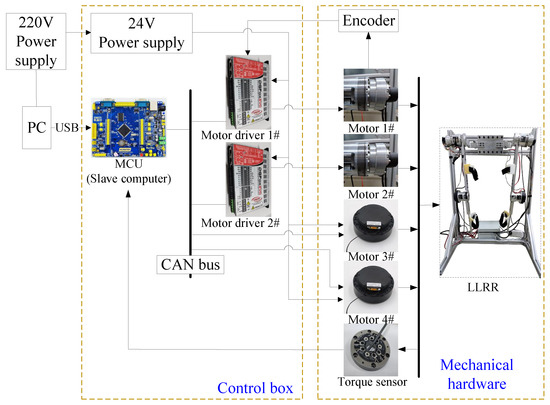 The LLRR adopts the master-slave distributed control, which mainly includes human-computer interface, STM32 microprocessor, servo motor drives, servo motors, and torque sensors, with the whole control system shown as in Figure 4. The two servo motors in the hip joint units are driven by two DGFox DX060 drives (HDT, Monte Di Malo, Vicenza, Italy), which have good interpolated position modes using the CANopen DS402 Protocol. The torque sensors and the encoders are used to collect torque and angle information of the LLRR.
