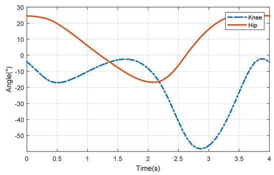 The motion data of normal human’s gait used in passive exercise comes from OpenSim software (developed by Stanford University), with one gait cycle 1 s. In order to obtain the tracking curve for training, the discrete data points in the gait are fitted by using MATLAB (MathWorks. Inc., Natick, Apple Hill Campus, MA, USA), and the coefficient that minimizes the residual error is found. The final equation of the design trajectory for passive exercise is as in (1). Considering that the gait speed of the patient during the rehabilitation process is low, the gait must be adjusted according to the actual rehabilitation needs. Therefore, the gait cycle of the LLRR is set to be 4 s, and the amplitude coefficient a, the frequency coefficient , the initial phase and the offset distance k in the standard gait are adjusted to obtain a suitable new gait.