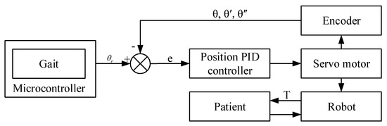 The specific implementation method of passive exercise is as the following. First, we set the training mode as passive exercise mode in the human-robot interface (HRI) which is coded by using C#, convert the desired motion trajectory into the motion angle of each servo motor, and send the angle information to the MCU, and the MCU will convert the angle information to CANopen communication message and sent to the servo driver; then, the LLRR can be controlled to conduct passive exercise. At the same time, the joint motion information collected by the encoder is fed back to the control system to form a closed-loop control, so as to realize the real-time monitoring and tracking of the LLRR’s motion trajectory. The flow chart of the passive exercise is shown as in Figure 6, where, , and represent the motor joint angle, angular velocity and angular acceleration during the rehabilitation training process, respectively; e and T represent the angle error and human-robot interaction torque, respectively; the is the reference trajectory.