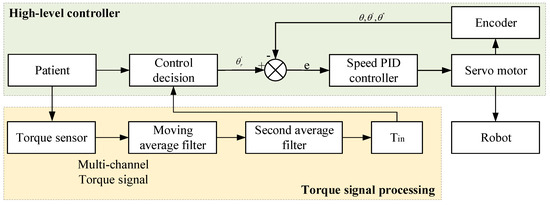 The proposed active exercise strategy includes two main aspects; one is the upper-level decision-making control system, which provides speed gain and position limit for the control strategy, inputs torque information to the controller, and outputs the target speed; The other is torque signal processing by using moving average filter and a second average filter to eliminate jumping points, and then input the torque value after filtering to the upper-level decision-making control system. The flow chart of the active exercise is shown as in Figure 7, where, the is the interaction torque after filtering. During the active exercise, we set the training mode to the active exercise in the HRI; The interactive torque between the patient and the LLRR is measured and transmitted to the MCU for filtering operation, which is sent to the upper controller for analysis and processing combining with the gait information; the control system converts the input torque to the desired speed of joint motion, guiding the robot to follow the gait trajectory to follow the patient to complete the gait movement, which means that when the measured interaction torque is zero, the angular velocity becomes zero too, and the LLRR will stay where it is. By setting different coefficient between the interaction torque and the speed, different actual gait trajectories can be obtained under the same torque, so as to match different rehabilitation situations.