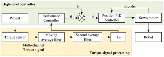 The resistance exercise is suitable for last stages of the patient’s rehabilitation, which can be used to enhance the muscle strength; By resisting the resistance added from the robot, the motivation of rehabilitation training can be further stimulated, and thus increase the lower limb’s muscle strength. For the LLRR, the position-based resistance control strategy is adopted, and the position control loop is corrected using the force signal as feedback. The specific implementation of the resistance exercise is as the follows. The human-robot interaction torque after processing is put into the resistance controller, which is the mapping between the interaction torque and the rotation angle; The resistance controller generates a deflection displacement relative to the initial position, and the deflection displacement depends on the size of the patient’s active torque and the resistance parameter setting, which means that when the interaction torque is zero, the LLRR will return to its initial position. The resistance training control flow chart is shown in Figure 8.