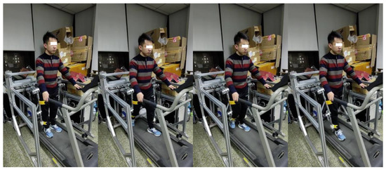 To verify the effectiveness of the development of the different training modes of the developed LLRR, experiments were conducted with one voluntary healthy subject (male, 25 years old). The subject signed informed consent before the experiments. All experiments were approved by the Ethical Committee of Beijing University of Technology and conformed to the Declaration of Helsinki. During the experiments, the subject wore the LLRR on the treadmill, as shown in Figure 9, and the three different rehabilitation training modes have been tested in turn, respectively.