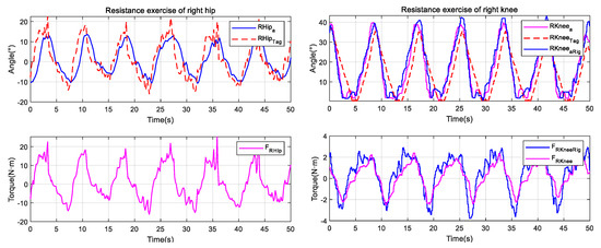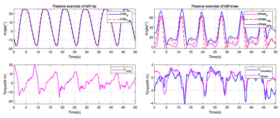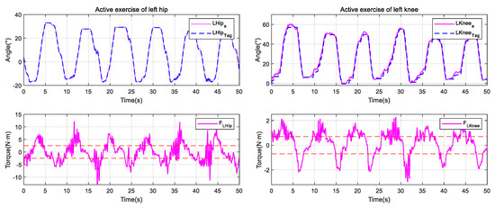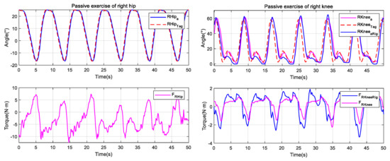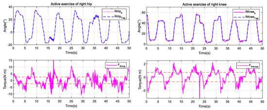 During the passive exercise, the involved subject wore the developed LLRR at first, and LLRR drove the subject according to the fitting curve of hip and knee joints as in Figure 5, and the experimental results of the left hip joint and left knee joint are as in Figure 10, while the experimental results of the right hip joint and right knee joint are as in Figure 11, where, , , and represent the expected trajectories corresponding to the left hip joint, right hip joint, left knee joint, and right knee joint, respectively, and are derived from the normal gait curve of the human body based on the passive exercise strategy; , , and represent the real-time feedback angles from the encoders of the left hip joint, right hip joint, left knee joint and right knee joint respectively, all of which are rigidly driven trajectories without flexible units; and represent the real-time feedback trajectory tracking results of the encoders at the left and right knee joints with flexible elements, respectively; , , and are the real-time feedback torque values from the torque sensors at the left hip joint, right hip joint, left knee joint, and right knee joint, respectively, from one subject without flexible units; and are the real-time feedback torque values from the torque sensors at the left and right knee joints with flexible units, respectively. From the results we can see that the LLRR can drive the subject along the preset trajectory no matter whatever the interaction torque is in the passive exercise mode. Also, under passive exercise, the expected trajectories of the hip joint and are similar to the actual trajectories and , but in the movement of the knee joint, the movement with the flexible unit is more in line with the expected trajectory, and the control experiment without the flexible element can be seen from the torque values; The combined action of a rigid-flexible characteristics improves stability and better handles disturbances, reducing joint interaction torques.