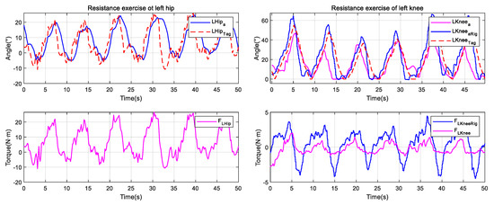 During the resistance exercise, the subject actively exerts torques on the LLRR to resist its mechanical impedance, and if the interaction torque becomes zero, the LLRR will return to its initial position, just like a pendulum. The results of the resistance exercise of the left hip joint and left knee joint are shown as in Figure 14, while the experimental results of the right hip joint and right knee joint are as in Figure 15. From the results we can see that the when the detected torque is continuously exerted in the same direction, the deviation angle grows larger until reaching the limit position, and when the exerted torque remains unchanged at one position, the deviation angle similarly remains unchanged; When the exerted torque becomes zero, the LLRR returns to the initial equilibrium position. Also, under this exercise mode, the expected trajectory of the knee joint has the same trend as the actual trajectory under two trials with and without flexible units, but the difference between the two settings can be observed in the torque value; although suffering a loss of accuracy on part of the trajectory, the mechanically rigid-flexible mixing effect makes the human-machine interaction torque smaller. The results of the experiment verifies the effectiveness of the developed resistance exercise.