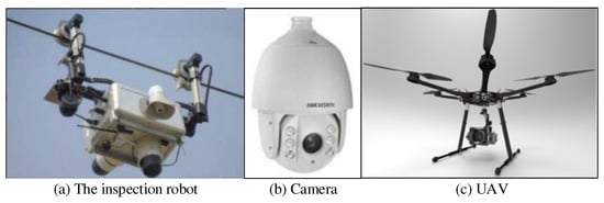 To better adapt to various complex environmental conditions and resist external disturbance, the system selects three kinds of acquisition equipment for the deployment of the image acquisition device, as shown in Figure 2. First, is the inspection robot of the transmission line (Figure 2a), which shuttles between transmission line poles and towers with a ground wire as a running track, and high-definition cameras are installed at the front end and bottom to collect images. Second, is a high-definition camera fixed on the top of the tower (Figure 2b). This camera is an online monitoring device, which has the advantages of a wide field of vision and high capture accuracy and can transmit the status information of the transmission line connecting fittings in different environments in real time. Third, is a patrol UAV (Figure 2c), which has the advantage of high flexibility through manual control, and is suitable for fine detection of transmission line equipment with potential risks. The hardware detection equipment is connected to the ground server base station through a wireless communication module, thus forming the whole transmission line online monitoring system.