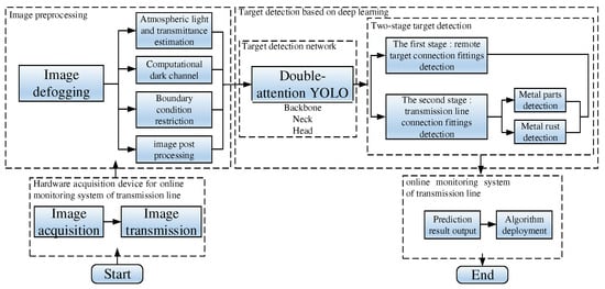 Inspection of Figure 4 shows that the overall design of the algorithm is divided into four parts, namely image acquisition and transmission, image defogging, connected hardware target detection, online monitoring of the deployment of the system algorithm. The image acquisition and transmission module are mainly completed by the system hardware. The image defogging algorithm is divided into a defogging stage and an image post-processing stage. The image post-processing stage improves the defogging effect through a series of segmentation and edge detection methods. The two-stage object detection algorithm is based on our proposed Double-attention YOLO model, which is the core module in the four stages of the whole algorithm. The last stage will output the test results to the transmission line online monitoring system for unified deployment and early warning. This completes the overall design of the whole rust detection method for connection fittings or parts on transmission lines.