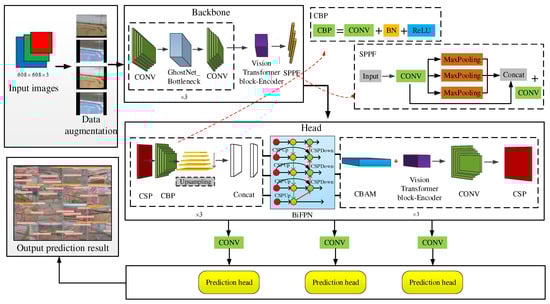 The overall network structure of the Double-attention YOLO model is composed of a backbone and a head. Before the feature extraction of the backbone part, the data enhancement operation is first performed by Maxup [29]. As shown in Figure 6, the backbone part of the model is composed of the GhostNet bottleneck and a convolution structure and then outputs to the Vision Transformer block and the SPPF layer. The function of the GhostNet module is to reduce the redundancy of model calculation information through linear operations to achieve model compression; the detailed structure will be described in Section 2.3.3. The function of Vision Transformer block is to enhance the global receptive field of the model on the feature map, capture more richer and stronger semantic information for subsequent input, and its detailed structure and working principle will be introduced in Section 2.3.1.