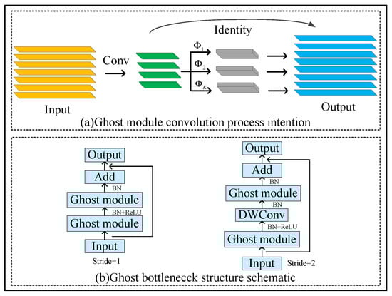 Further inspection of Figure 8 shows that the GhostNet module is composed of a Ghost convolution stack. It generates a small number of feature graphs from conventional convolution through a small filter and then generates a new feature map like it by a series of linear operations. The combination of the two groups of feature graphs is the result of the model output. If the size of the input feature map is , and the corresponding output size is , the size of convolution kernel is . By convolution produce and then through linear transformation , the ghost characteristic graph is generated, and the calculation formula is shown in Formula (16):