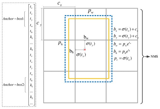 Among them, is the sigmoid operation, by compression reach interval to enhance the positioning accuracy of the bounding box, is the prediction scale, is confidence, is the grid coordinates of the feature map, is the scaling factor, are the width and height for anchors, can be regarded as the learning prediction target. The center of the boundary box is placed in the grid of the second row and the second column. The prediction boundary box with low score is filtered out by confidence threshold, and the prediction box is obtained by non-maximum suppression (NMS). To reduce the bias caused by anchors clustering, we used the instead of Euclidean distance in the original algorithm, the new distance measure function is shown in Formula (17):