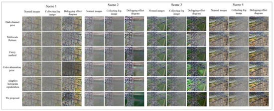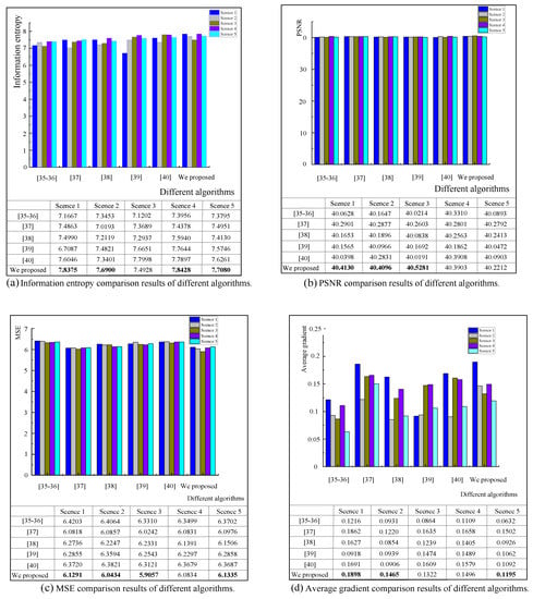 To verify whether the restoration effect of the defogging algorithm in this paper was universal, six kinds of current advanced defogging algorithms were selected for comparative experiments in five different scene environments. Four kinds of image quality evaluation indexes: information entropy, Peak Signal to Noise Ratio (PSNR), MSE and average gradient were used to compare the implementation effects of various algorithms in different environments. The statistical results are shown in Figure 11a–d, where [35,36] was the Dark channel prior algorithm, Ref. [37] was the Multiscale Retinex algorithm, Ref. [38] was the Fuzzy method algorithm, Ref. [39] was the Color attenuation prior algorithm, Ref. [40] was the Adaptive histogram equalization algorithm, and the last column was our proposed method. The dominant data at the bottom of the histogram is displayed in bold font and the visualization results of the various algorithms are shown in Figure 12.