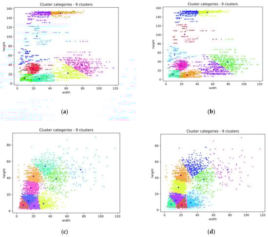 Visual comparison results of two-stage data clustering. (a) The results of one-stage anchors of K-means clustering; (b) The results of one-stage and genetic algorithm improvement; (c) The results of two-stage anchors of K-means clustering; (d) The results of two-stage anchors and genetic algorithm improvement.