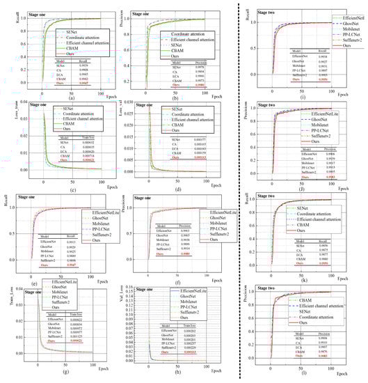 Figure 14c,d shows the training and validation loss function curves of several models. It shows that the overall decline process of loss function obtained by our method was smoother than other models, and the loss value reached the lowest at the 100th epoch, which were: train loss: 0.000621, Val loss: 0.000163. We also carried out comparative experiments on the network where the backbone of YOLOv5 was replaced by lightweight compression models; several types of lightweight models were used, EfficientNetLite, GhostNet, Mobilenet, PP-LCNet, and Sufflenetv2. Figure 14e,f shows that the recall and precision of the Double-attention YOLO model were 0.18% and 0.24% higher than those of the model whose backbone was only GhostNet, and 0.58% and 0.93% higher than other compression models in the best recall and precision performance. This shows that the global self-attention mechanism and channel space attention mechanism provided by Vision Transformer can make up for the precision loss caused by model compression when redundant parameters are eliminated. Figure 14g,h shows the compression model training and validation loss curve. It shows that the loss value of our method at the 100th epoch reached the global minimum, which was 0.000621 and 0.000163, respectively. Figure 14i–l shows the comparison results of recall and precision scores of various models in the second stage. It shows that the recall value of our method reached 0.9956, and the precision value was 0.9983, which had the best effect among all the attention mechanisms and model compression backbone networks.