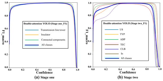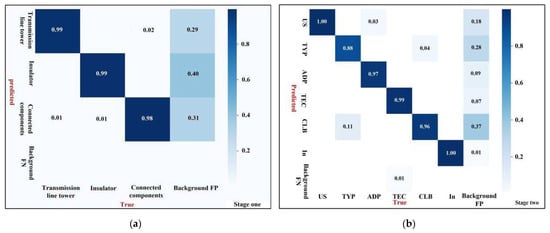 According to the real value and prediction value of the confusion matrix, for normal and potential objects to be detected, the model classifier can generally reflect the high classification accuracy, but to a certain extent, there is a phenomenon of missing detection, which may be caused by serious target occlusion or difficult to capture small targets. In Figure 15a, the predicted values of the Transmission line tower and Insulator reach 99%, indicating that the network had good detection effect for such categories. Among them, the background misjudgment rates for Insulator and connected components were high, reaching 40% and 31%, respectively, indicating that the complex environmental background has interference factors for small targets. Inspection of Figure 15b shows that the predictive value for the Triangular yoke plate (TYP) was relatively low and there was a probability that it would be misjudged as the Clamp bolt (CLB), because many Clamp bolts were connected to the Triangular yoke plate. However, the initial annotation box of the two categories may overlap, resulting in a small number of errors in the generation of anchors. The prediction accuracy of other categories such as U-shackle (US), Insulator (In), Tension clamp (TEC), and so on, were all above 99%. The detection accuracy and classification effect in the second stage were excellent.