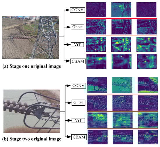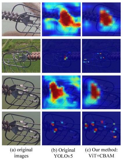 Figure 17 shows that after extracting the shallow feature information, the model can effectively segment the foreground region and background region where the defect is located. After pruning using the GhostNet module linear transformation, the down sampling effect of feature map is obviously enhanced. Nonetheless, the ViT module provides more abstract global spatial information for the feature graph, and the semantic information of the high-level of the feature graph is fuzzy. Finally, through the CBAM module, the feature extraction network can accurately capture the local fine-grained information. From the visualization results of feature map, we can see that the Double-attention YOLO model can fully extract the texture, shape, and edge information in the datasets image of transmission line connection fittings.