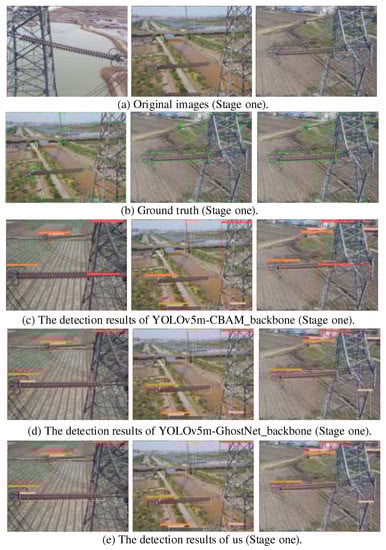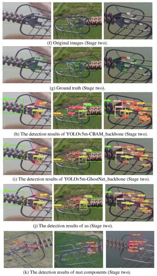 To further verify the effect of our proposed Double-attention YOLO model in dealing with large scene depth, small target detection, and target occlusion, three kinds of new images without network training were selected to verify the model detection effect. The selected test data had the following characteristics: the background conditions were complex and diverse, there were mixed multi-scale targets to be detected, as shown in Figure 19. Figure 19a–e shows the detection result of the first stage, Figure 19f–k shows the detection result of the second stage, and Figure 19k shows the rust fault detection results of metal parts in the second stage. In this test, CBAM and GhostNet were used to replace the backbone of the YOLOv5 baseline model, and the detection results of the Double-attention YOLO model were compared. Therefore, it reflects the detection advantages of this paper after integrating the above model structures. The following three types of models were called model 1, model 2, and model 3, where the first line of each phase enters the original image of the test, the second line manually marks the ground truth, followed by the test result.