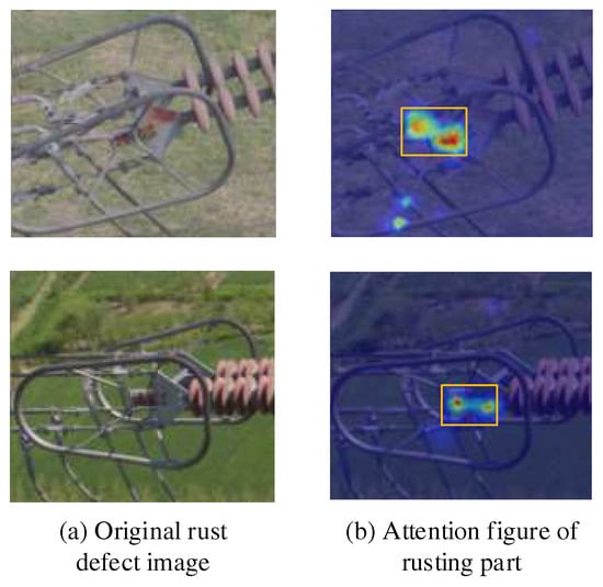 Figure 20 shows that the darker the heat map area in the attention map, the greater is the probability of rust defects. The CBAM attention mechanism can effectively locate the rust area to be detected, further reducing the focus of model feature extraction. The part, and the CBAM module can focus on the rust area with high uncertainty of area, shape, and color in a complex environment, thereby helping the model to improve the efficiency of feature extraction.