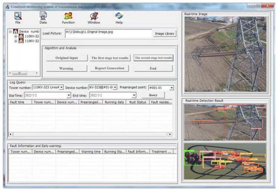In the process of the algorithm design, we also deployed the hardware equipment and the detection algorithm and developed the condition monitoring system of transmission line connecting fittings based on mobile terminal application. The software interface for the application system is shown in Figure 21. Its functions include calling the camera for real-time state monitoring, outputting the algorithm identification results of each stage, judging the fault type and warning. Users can adjust the state parameters of the UHV transmission line according to the actual situation to adapt to different application scenarios. The data acquisition sources of this software interface were the tower end HD camera and the line inspection robot, as shown in Figure 2a,b. Therefore, the installation location of the equipment, the acquisition angle of the image, the construction of the data analysis platform, and the connection of the LAN need to be properly adjusted according to the field environment.