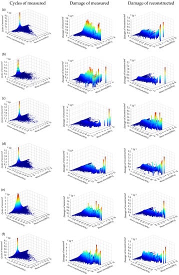 As revealed in Figure 15, the distribution of load cycle counts is similar among the eight load types, but the highest cycle counts appear in L6#, and the lowest occur in L9#. The cycles of the measured spectrum are symmetrically distributed except for the L3#, and more than 95% mean load counts are concentrated within ±10 MPa. For the damage contour map, both measured and reconstructed damage are concentrated in the middle area of mean and amplitude stress, with a maximum measured damage of 1.5 × 10−7 and a maximum reconstructed damage of 3.9 × 10−7.