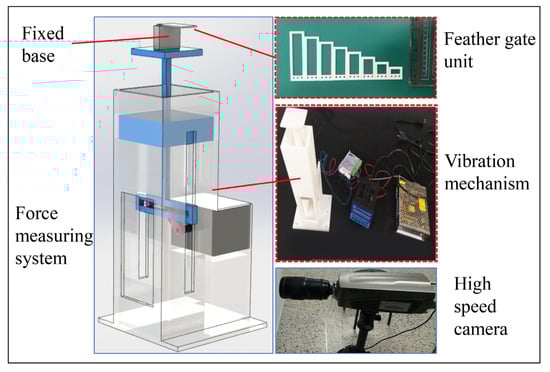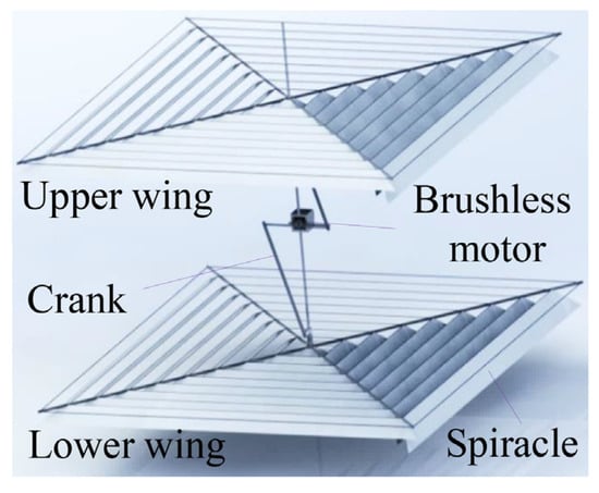 In this study, a three-dimensional physical model of a new variable wing hovering vehicle was developed (Figure 1). The main purpose of this study was to provide theoretical guidance for the development of a large-load hovering vehicle with a simple actuation mode and large-area array airfoil. The microstructure of bird feathers and the change in their structures during flight [27,28] inspired the design of a variable-array feather airfoil. The airfoil design is composed of spiracle units that can be opened and closed passively. The two wings are distributed vertically and vibrate reciprocally in opposite phases. This design ensures consistent speed throughout the airfoil, and the relative motion of the two airfoils facilitates the offset of the airfoil inertial forces to improve the vehicle stability. To facilitate the design of the vehicle, a theoretical aerodynamic model of vehicle kinematics was developed and validated by numerical calculations and tests of the spiracle unit’s opening and closing characteristics. The opening and closing characteristics of the spiracle unit were investigated through controlled-variable experiments, whose results provided guidance for the parameter design of the prototype.