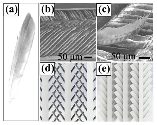 Pigeons are highly skilled in flight. Figure 2a–c shows the structure of the primary flight feathers of pigeons. The feathers are epidermal derivatives unique to birds that assume the function of flying, and the large feathers located in the wings, the flight feathers, are the feathers that power the bird’s flight. Each flight feather consists of a feather shaft and soar on either side, as shown in Figure 2a. Figure 2b shows that the soar is composed of a series of branches arranged in parallel and at a certain angle with the feather shaft. The feather branches are composed of the shaft and willow leaf-shaped hooked and unhooked branchlets on both sides, and the two types of branchlets are arranged in a tile-like pattern with the small hooks hooked to each other to form a tight feather tail, as shown in Figure 2c. The opening (Figure 2d) and closing (Figure 2e) of the feathers during flight causes bilateral airflow through asymmetry. When the wings are fluttering upward, the feather twigs are separated by airflow to reduce drag. When fluttering downward, the feather twigs cover each other by inertial force, airflow, and small hooks to increase lift.