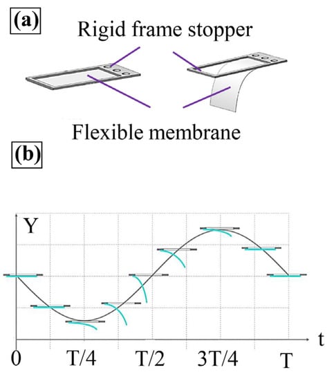 Passive spiracle design: (a) Physical model of the spiracle unit. (b) Model of the opening and closing of the spiracle unit in one vibration cycle.